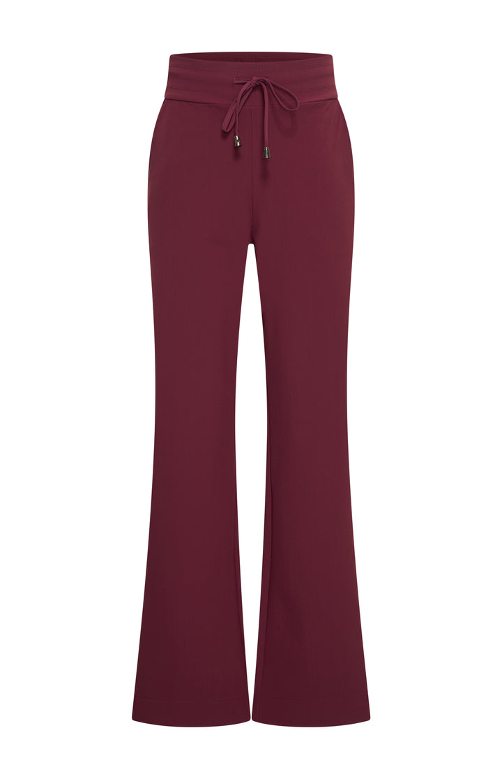 Dit model broek is uitgevoerd in bordeauxrood en heeft rechte broekspijpen.