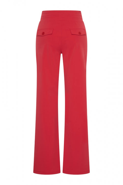Dit model broek is uitgevoerd in rood en heeft rechte broekspijpen.