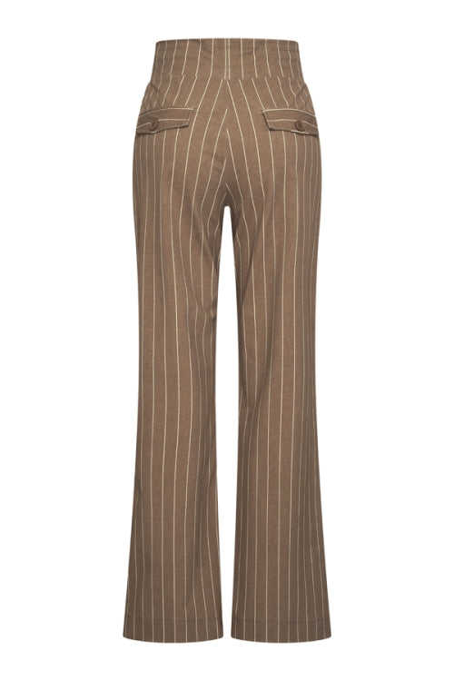 Dit model broek is uitgevoerd in een taupe kleur met een lichte streep en heeft rechte broekspijpen.
