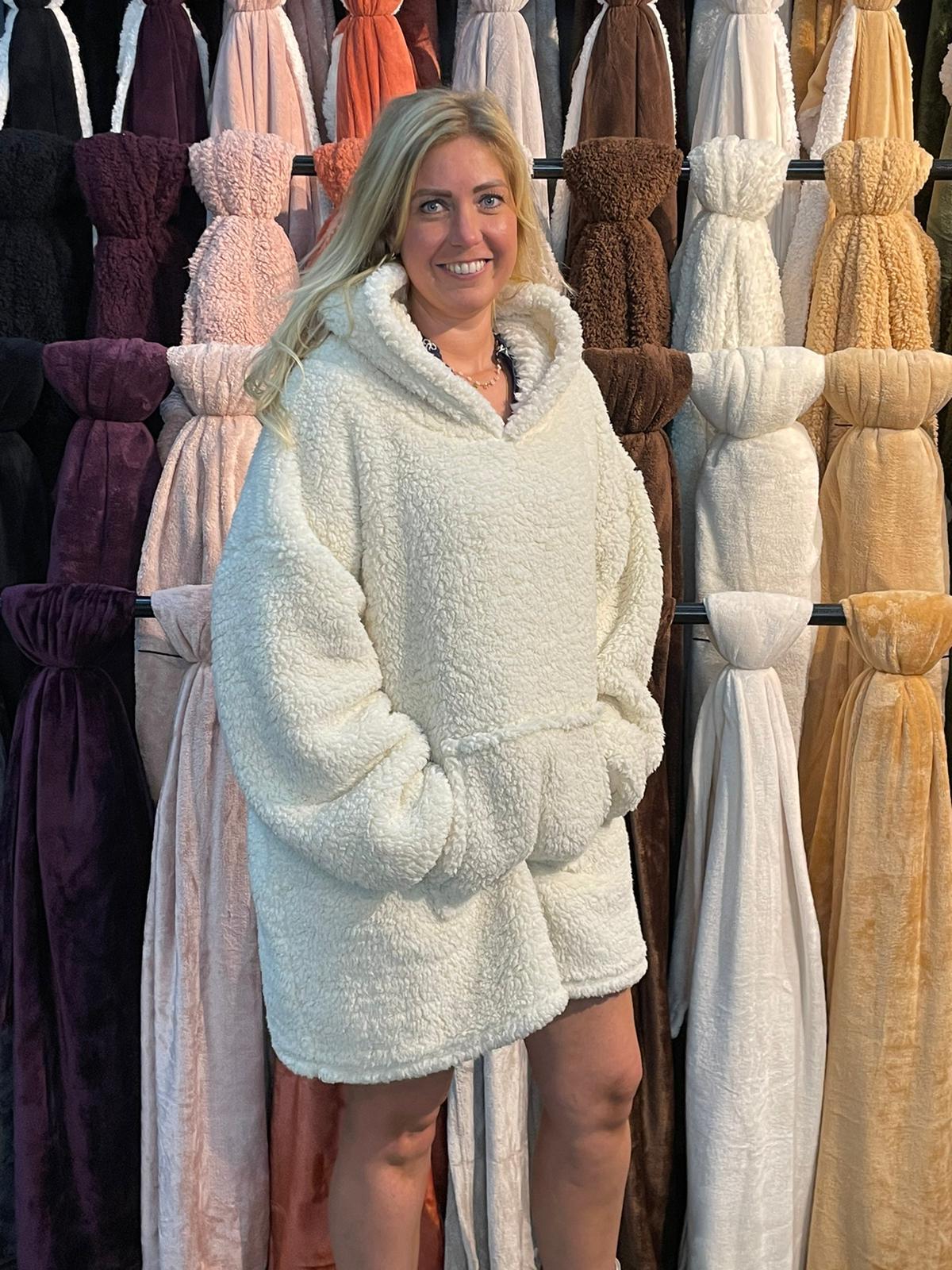 De teddy hoodie van polyester is one size en is draagbaar t/m maat 48.