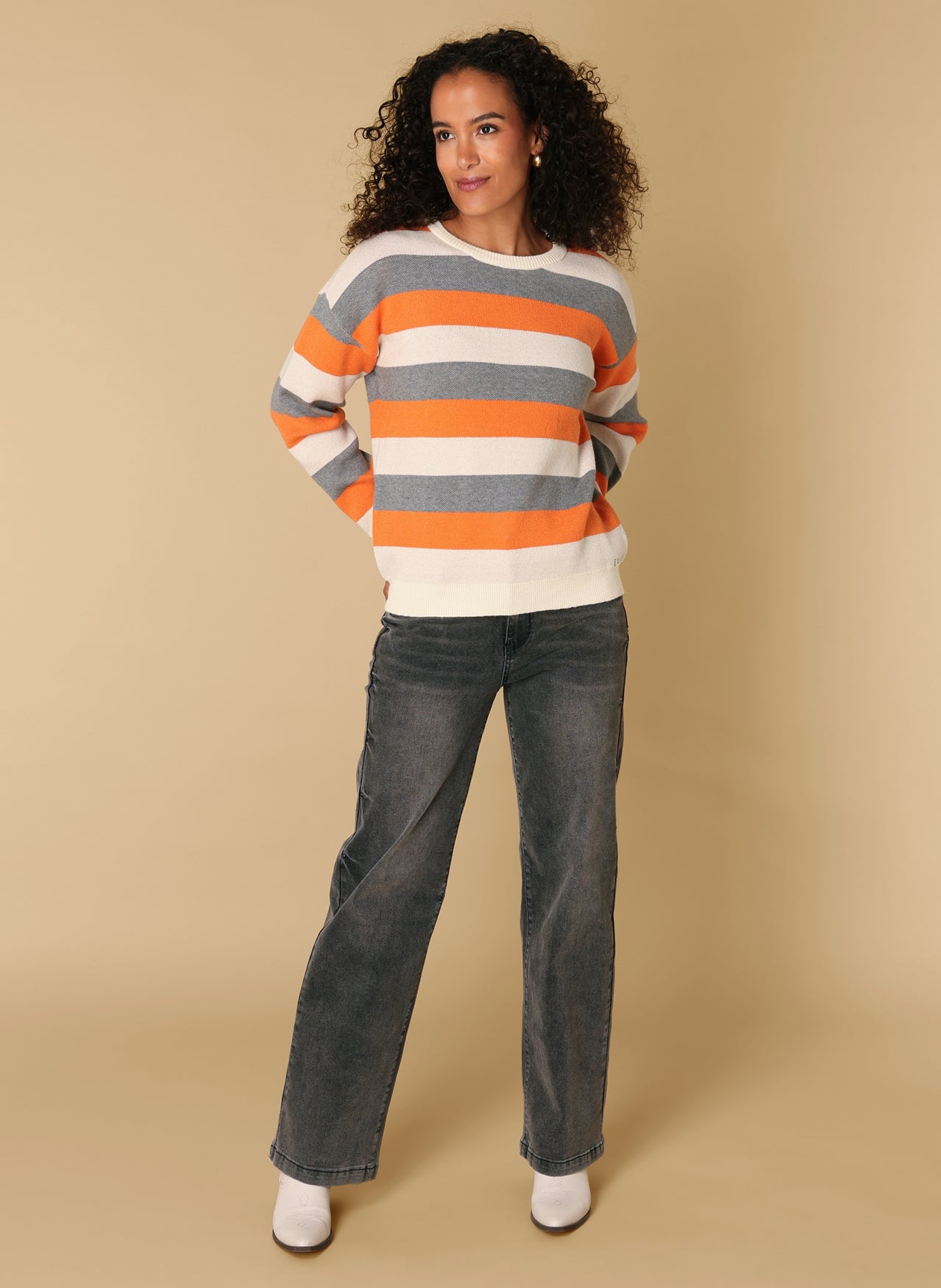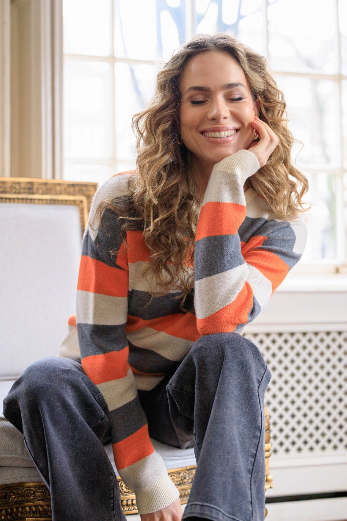 Deze trui is een instant oppepper voor je look. De brede strepen in mandarin, ecru en grijs maken ‘m speels, terwijl de zachte viscoseblend heerlijk comfortabel draagt. Een relaxed silhouet met precies genoeg flair!